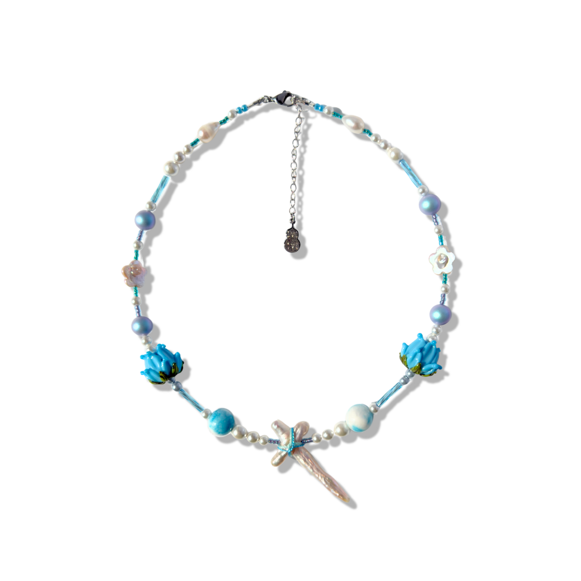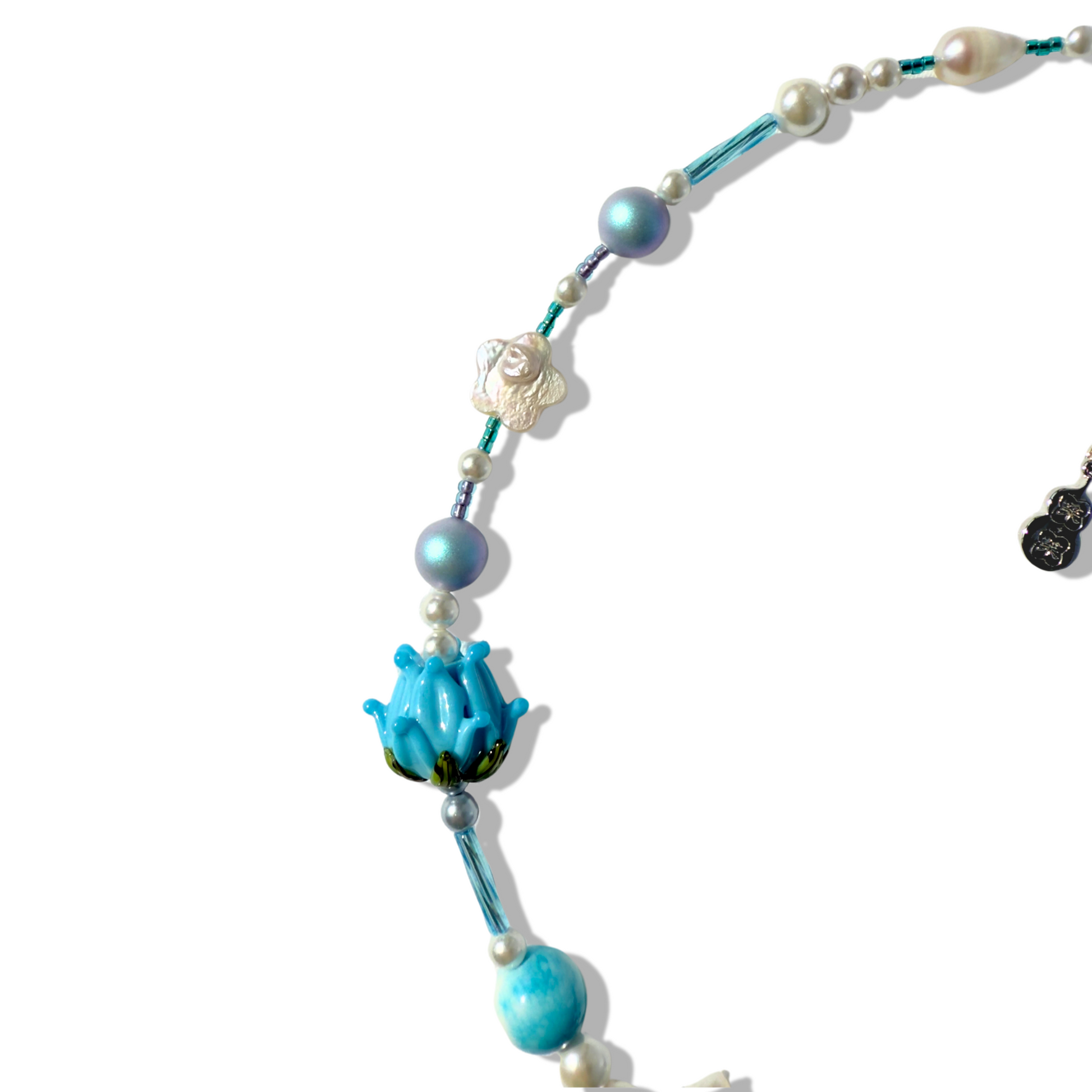 Twin lotus blossoms bloom in icy tones, representing spiritual growth, purity, and peace. A serene and elegant necklace with meaningful symbolism.