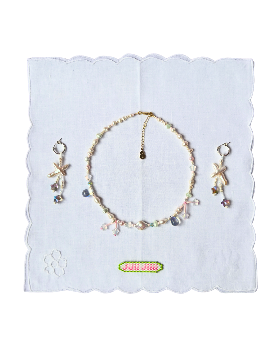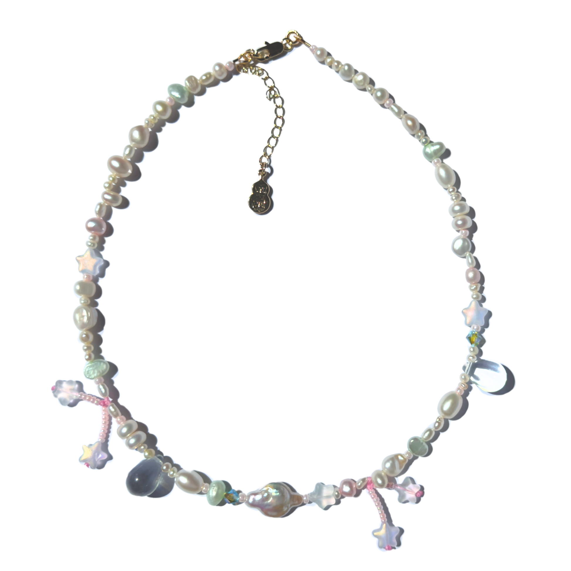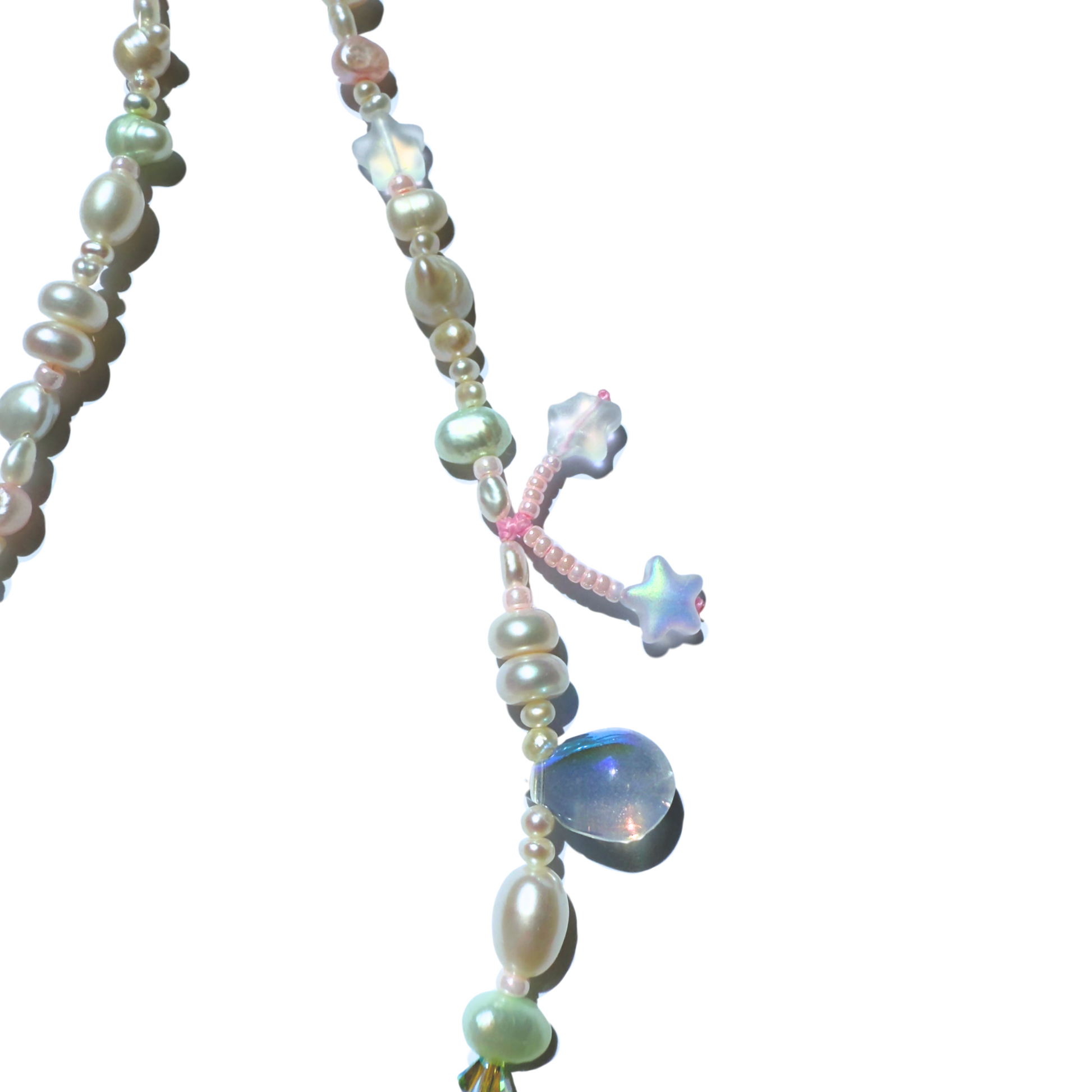 A dreamy pastel pearl necklace sprinkled with glass stars — like tiny shooting stars caught in candy clouds. Wear it as a wish upon the stars, and may every dream you carry come true. A soft shimmer of hope and magic for everyday wear.