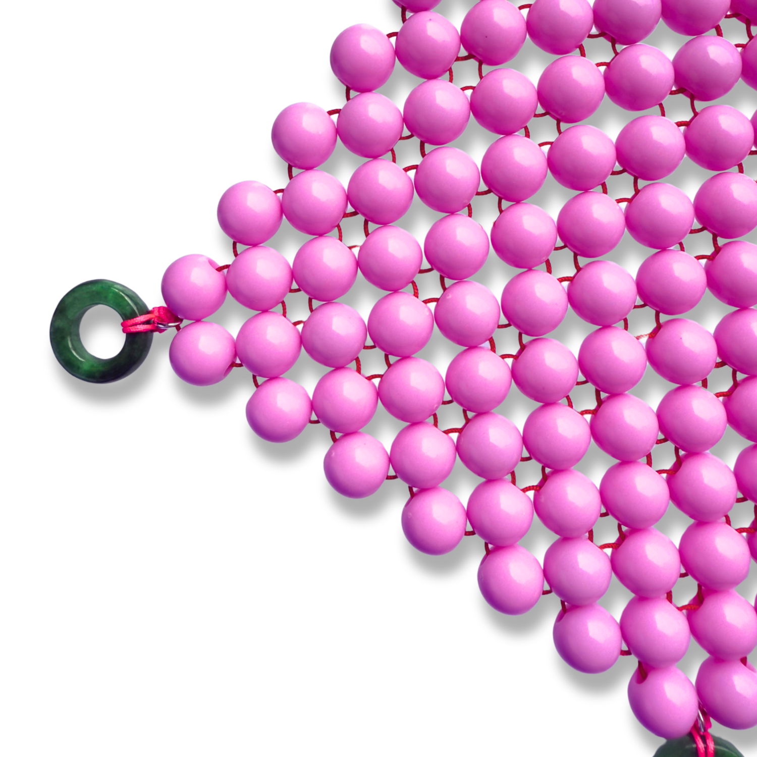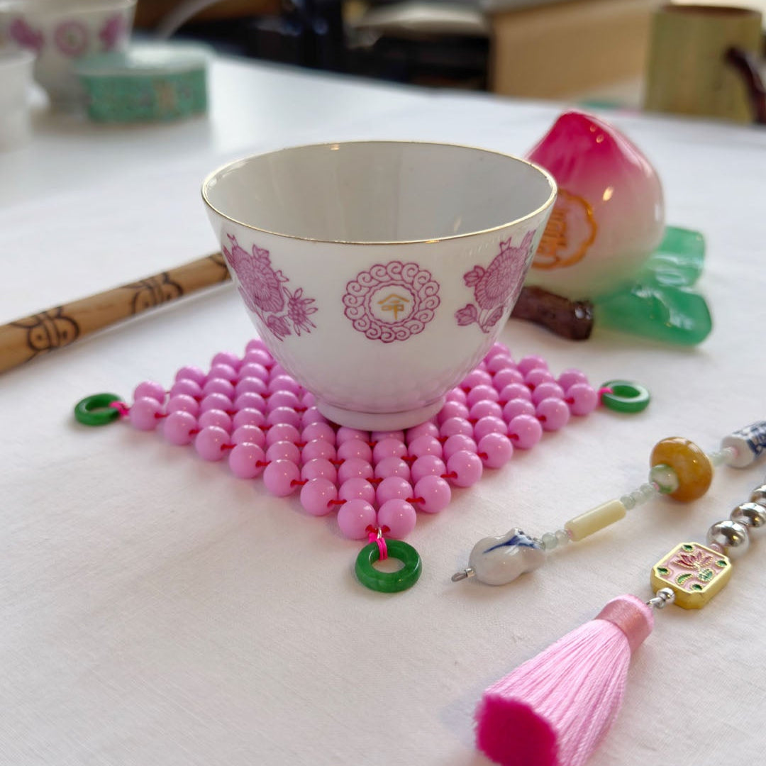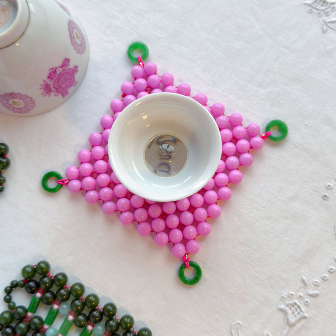这款充满活力的手工串珠杯垫体现了丰饶和营养的祝福,其灵感来自桃子,被认为是一种受祝福的水果🍑长寿和永生的象征。