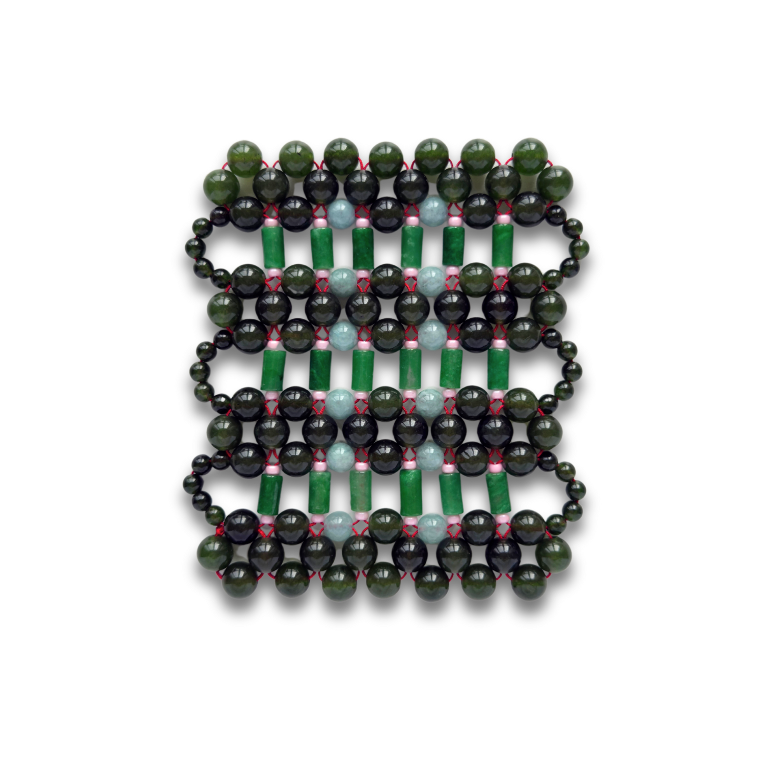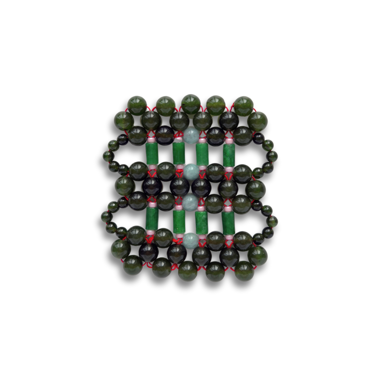 这款手工制作的玉石杯垫,用传统的红绳精心连接,象征着繁荣,其灵感来源于算盘——中国文化中计算和财富的工具。